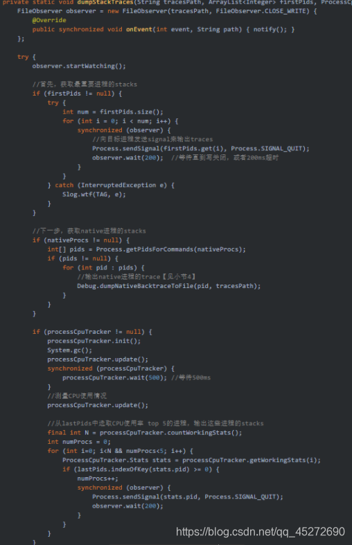 5.当UI线程收到该消息后,会调用dumpStackTraces函数: