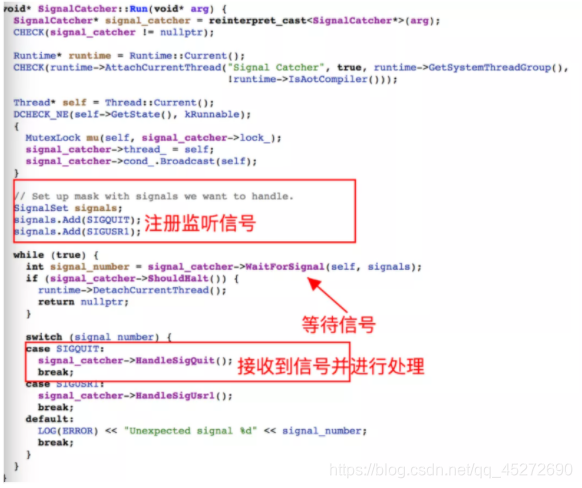1.一个进程接收到了SIGQIUT信号的时候,SingaCatcher线程的WaitForSignal函数会返回接着会调用到HandlerSigQuit()函数。