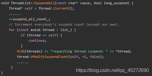 这个挂起SupendAll实在Thread_list.cc中实现的,他的作用就是用来suspend当前进程里面所有其他的线程(一般发生在GC,DumpForSigQuit等过程中)。SuspendAll过程实现最重要的就是ModifySupendCount(self,+1,false)这段语句他会修改对应Thread对象的suspend引用计数: