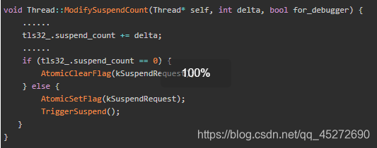因为传入的delta值是+1所以会先执行AtmoicSetFlag()利用原子操作设置了KSuspendRequest标志位,代表当前这个线程有挂起请求。什么时候会进行检测这个标志位呢?这里涉及到了checkPoint的知识点最后讲解(在线程运行中进行上下文切换(例如java线程转换为Native线程)时就会运行CheckSuspend函数,这个函数才是真正的把当前线程suspend: