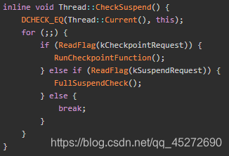 会在这个点执行线程的CheckPoint函数;如果发现当前线程有suspend request时,会进行SuspendCheck,使得线程进入Suspend状态(暂停);