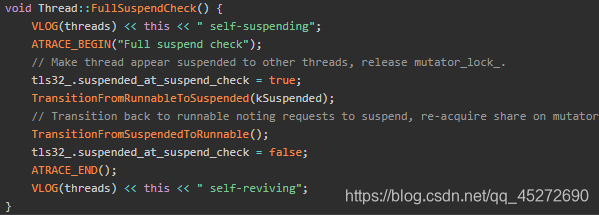 可以看到检测到了KSuspendRequest标记就会执行FullSuspend函数,KSuspendRequest标志位是用来dump线程的堆栈的,分析完了SuspendAll之后,再继续分析FullSuspendCheck函数:
