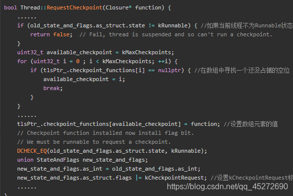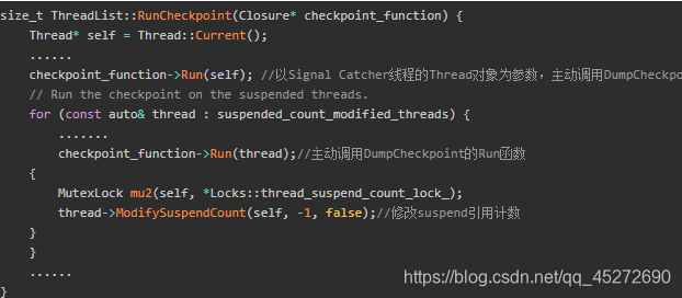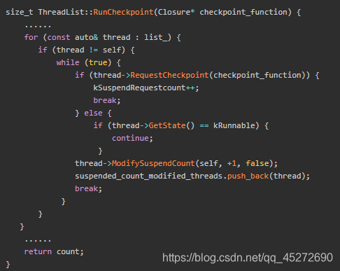 对于处于Runnable状态的线程执行它的RequestCheckpoint函数会返回true,其他状态的线程则会返回false。对于这些非Runnable状态的线程就会像SuspendAll一样会设置KSuspendRequest标志位,后面状态切换的时候就会检查这个标志位挂起。同事RunCheckPoint函数会把这些线程统计到suspend_count_modified_threads这个Vector变量中,在这个变量中的线程,Singal Catcher线程会主动触发他们的dump堆栈过程。接下来再看看这个RequestCheckpoint函数