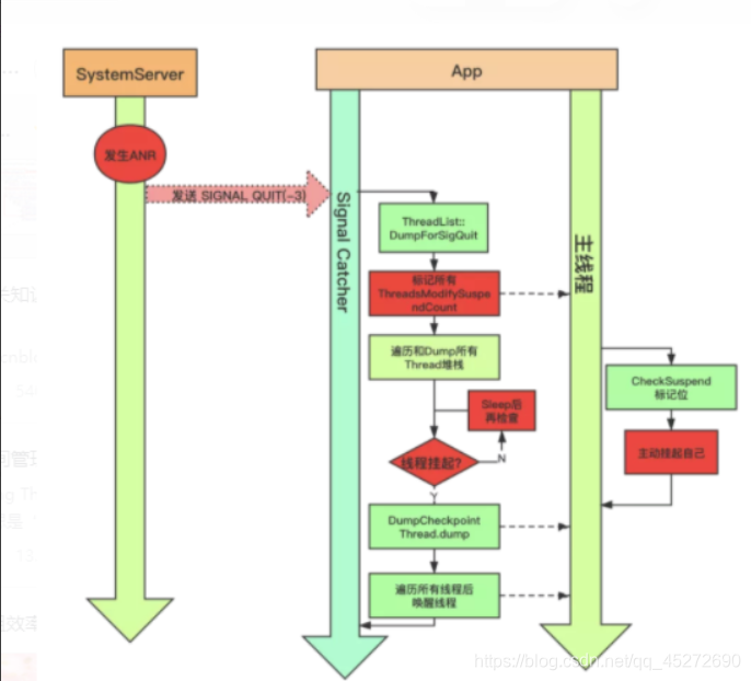 (Android5.0之前是dump用的SuspendAll线程,收集信息之后用ResumeAll恢复。在5.0之后采用的是checkPoint进行dump信息)