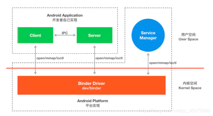 其中 Client、Server、Service Manager 运行在用户空间,Binder 驱动运行在内核空间。