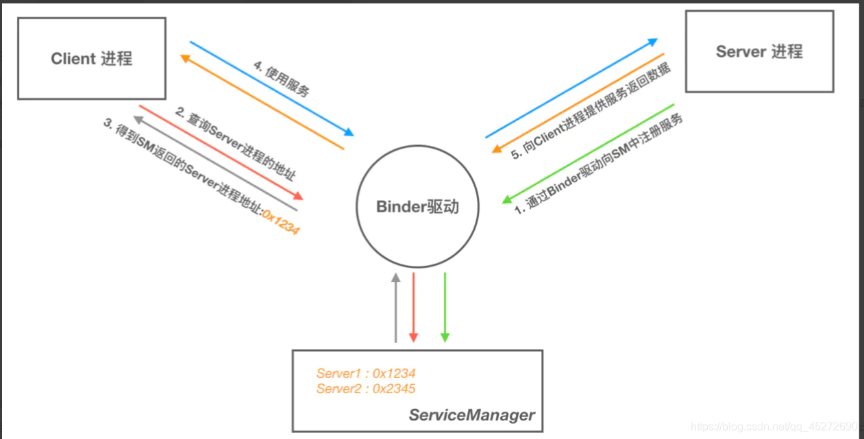 3.Client 通过名字,在 Binder 驱动的帮助下从 ServiceManager 中获取到对 Binder 实体的引用,通过这个引用就能实现和 Server 进程的通信。