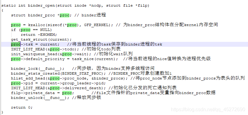 创建binder_proc对象,并把当前进程等信息保存到binder_proc对象,该对象管理IPC所需的各种信息并拥有其他结构体的根结构体;再把binder_proc对象保存到文件指针filp,以及把binder_proc加入到全局链表binder_procs。