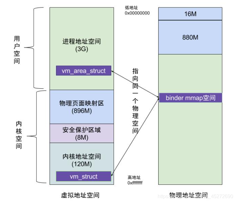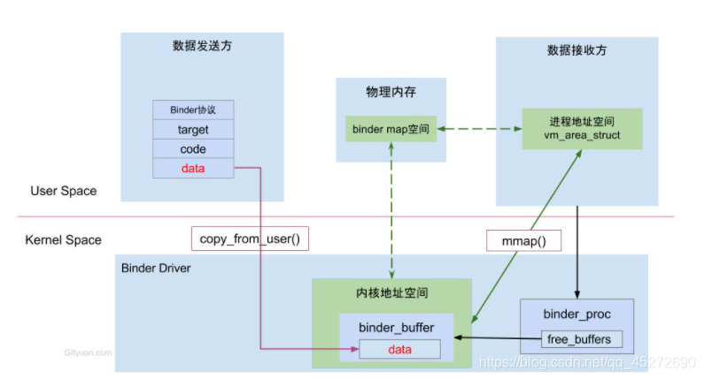 而 Binder 并不存在物理介质,因此 Binder 驱动使用 mmap() 并不是为了在物理介质和用户空间之间建立映射,而是用来在内核空间创建数据接收的缓存空间。