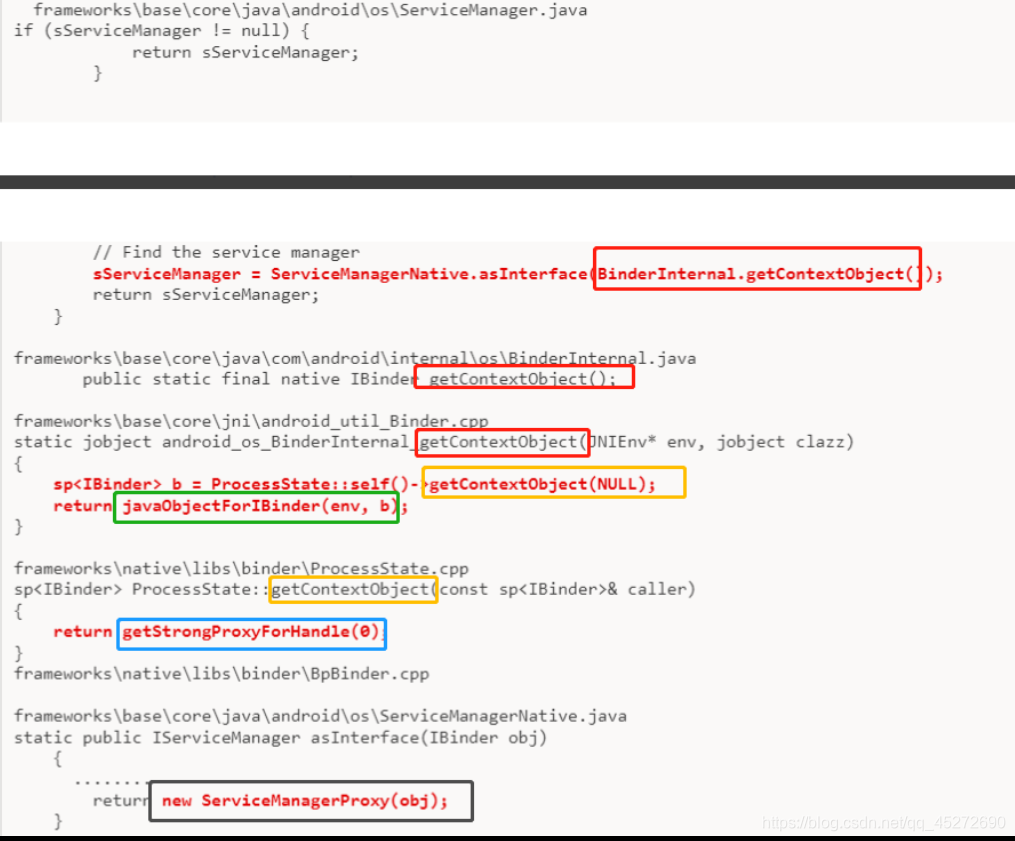 通过BinderInternal.getContextObject()调用获取到句柄值为0的BpBinder native对象,最终通过javaObjectForIbinder()函数的jni转换为BinderProxy类对象其实就是填充了这个类的mObject对象也就是ServiceManager Binder对象的引用封装对象,所以SMN才能通过asInterface完成代理Proxy的实例化
