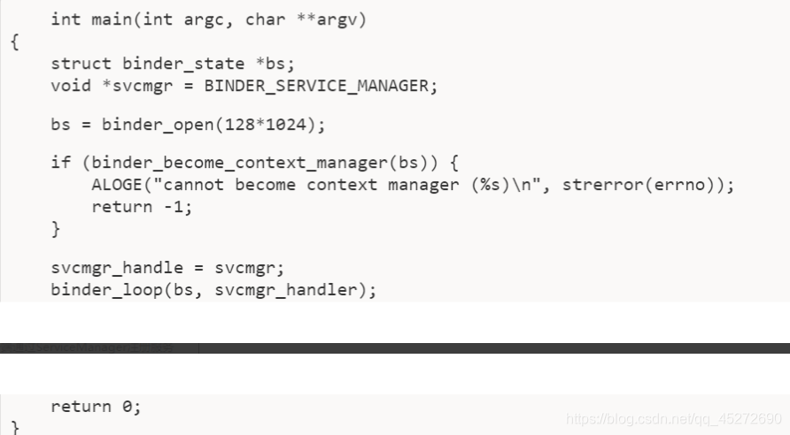 首先在android系统开始启动时通过init.rc启动了servicemanager(Native进程)可执行文件进程,系统真正的ServieManager管理最终通过Native进程servicemanager来完成。接下来分析在main函数中做了那些事情: