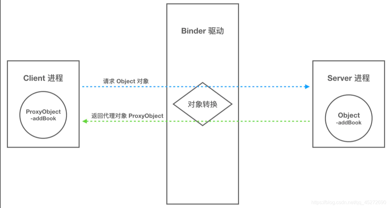 当 A 进程想要获取 B 进程中的 object 时,驱动并不会真的把 object 返回给 A,而是返回了一个跟 object 看起来一模一样的代理对象 objectProxy,这个 objectProxy 具有和 object 一摸一样的方法,但是这些方法并没有 B 进程中 object 对象那些方法的能力,这些方法只需要把把请求参数交给驱动即可。对于 A 进程来说和直接调用 object 中的方法是一样的。