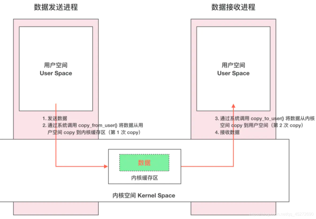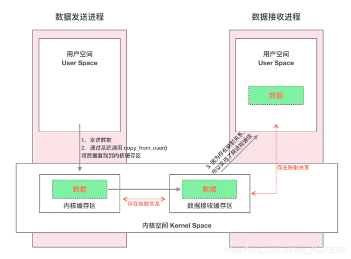 3.发送方进程通过系统调用 copy_from_user() 将数据 copy 到内核中的内核缓存区,由于内核缓存区和接收进程的用户空间存在内存映射,因此也就相当于把数据发送到了接收进程的用户空间,这样便完成了一次进程间的通信。
