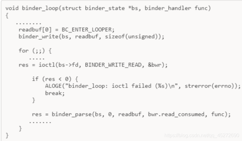 3.Binder_loop(bs,svcmgr_handler)通过iotcl发送BINDER_WRITE_READ命令并携带BC_ENTER_LOOPER请求命令告知Binder驱动创建了binder主线程并使binder驱动创建与之对应的binder_thread结构体存储到binder_proc中,并通过for循环进入循环读取binder驱动返回信息的循环流程
