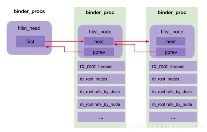 Binder驱动中通过static HLIST_HEAD(binder_procs);,创建了全局的哈希链表binder_procs,用于保存所有的binder_proc队列,每次新创建的binder_proc对象都会加入binder_procs链表中。
