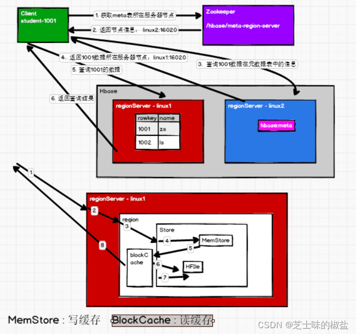 1)Client先访问zookeeper,从meta表读取region的位置,然后读取meta表中的数据。meta中又存储了用户表的region信息;