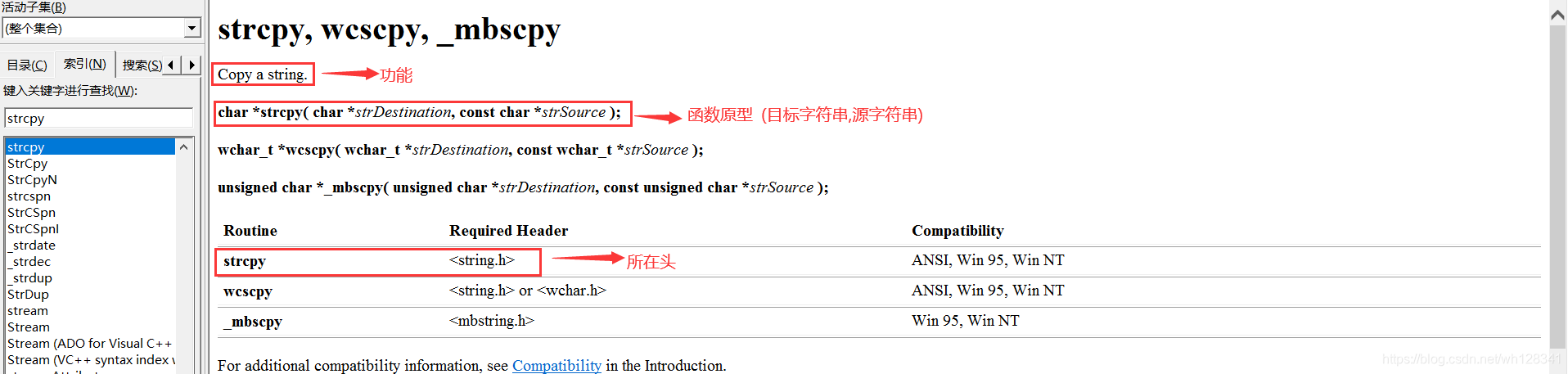 通过查询我们发现strcpy的基本信息。功能是拷贝字符串、所在头文件string,以及函数的返回值类型(char*)、参数(两个char*类型的参数)