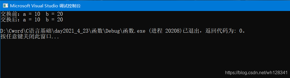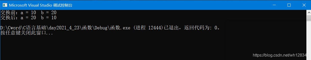 #include<stdio.h> //这里只是交换变量,不需要返回值(void) void Swap1(int x, int y) { int temp = 0; temp = x; x = y; y = temp; } int main() { int a = 10; int b = 20; printf("交换前:a = %d b = %d\n", a,b);//10 20 Swap1(a,b); printf("交换后:a = %d b = %d\n", a,b);10 20 return 0; }