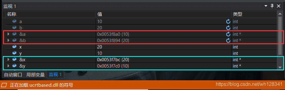 经调试:在main函数内创建了a和b的空间,在Swap函数内创建了x和y的空间;