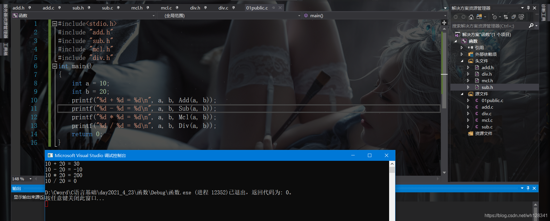 #include<stdio.h> int main() { int a = 10; int b = 20; //函数的声明 - extern可加可不加 extern int Add(int, int); int c = Add(a,b); printf("%d\n", c); return 0; } //函数的定义 int Add(int x, int y) { return x + y; }