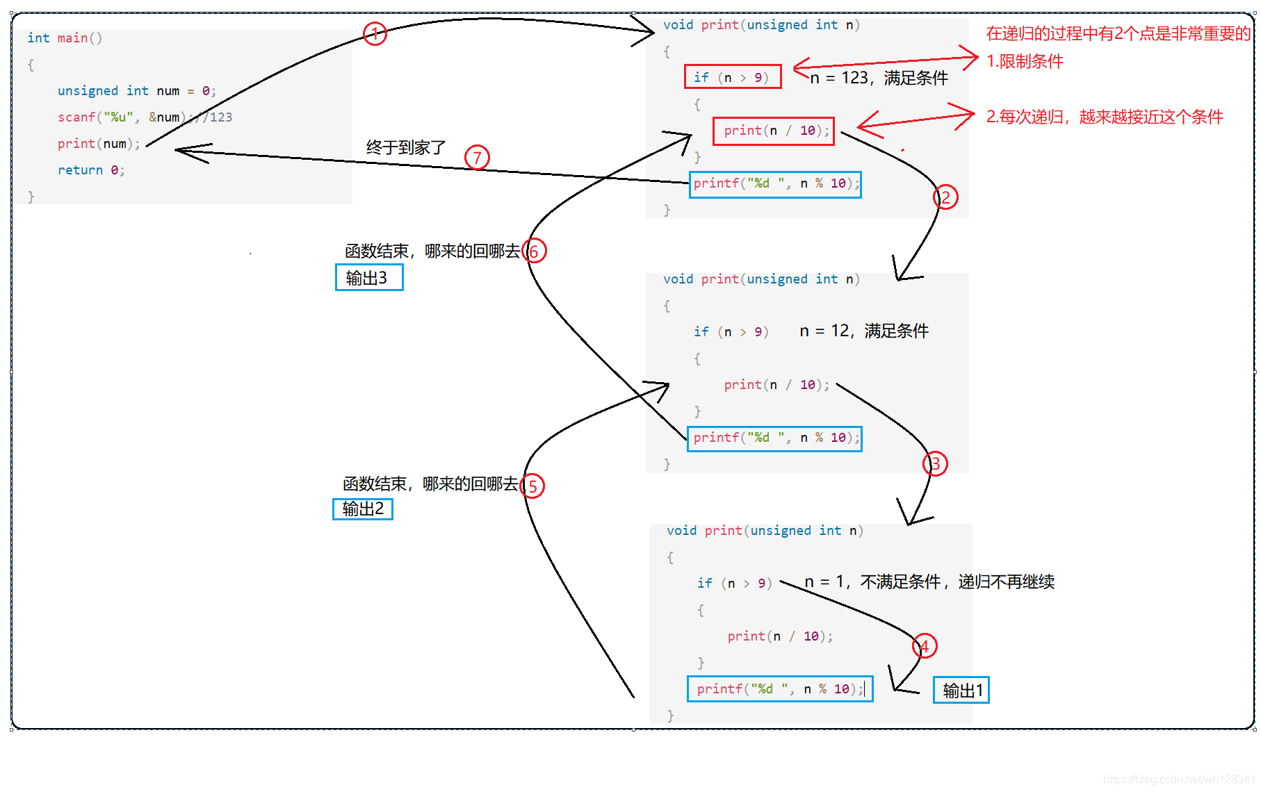 void test(int n) { if(n < 10000)//限制条件 { test(n + 1);//且每次越来越接近这个限制条件 } } int main() { test(1); return 0; }