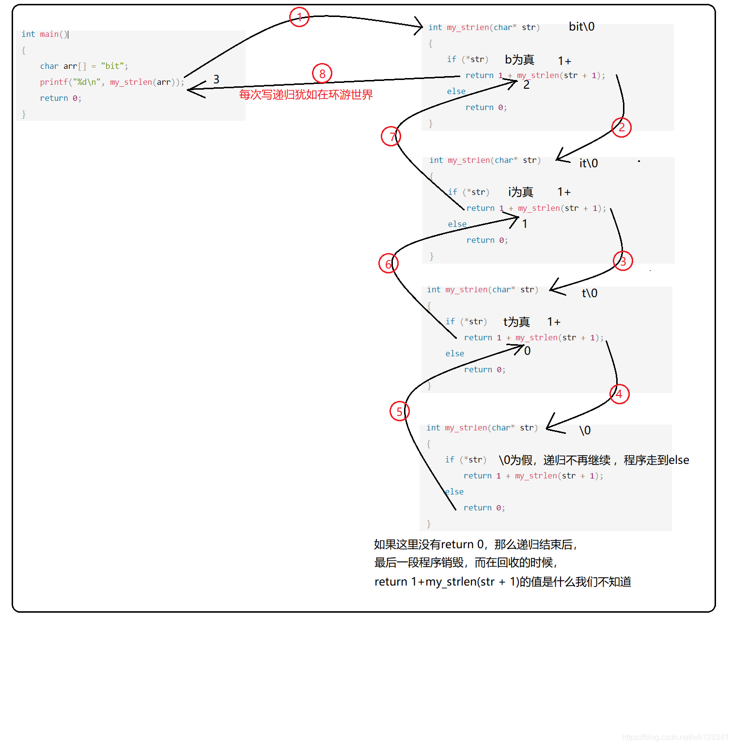 #include<stdio.h> int my_strlen(char* str) { if (*str)//限制条件 return 1 + my_strlen(str + 1);//且每次递归 越来越接近于这个限制条件 //return 1 + my_strlen(str++);//err;str++和++str这2种写法是错误的,在递归中也不建议这样写 else return 0;//注意这里return 0是必需有的,因为在最后条件不满足时,递归结束,程序回收,返回到上1级的递归时 -> return 1 + my_strlen(str + 1),这里的值是未知的 //所在在写递归时我们不仅要考虑到递归的3个条件,还要在回收递归时多加考虑 } int main() { char arr[] = "bit"; printf("%d\n", my_strlen(arr)); return 0; }