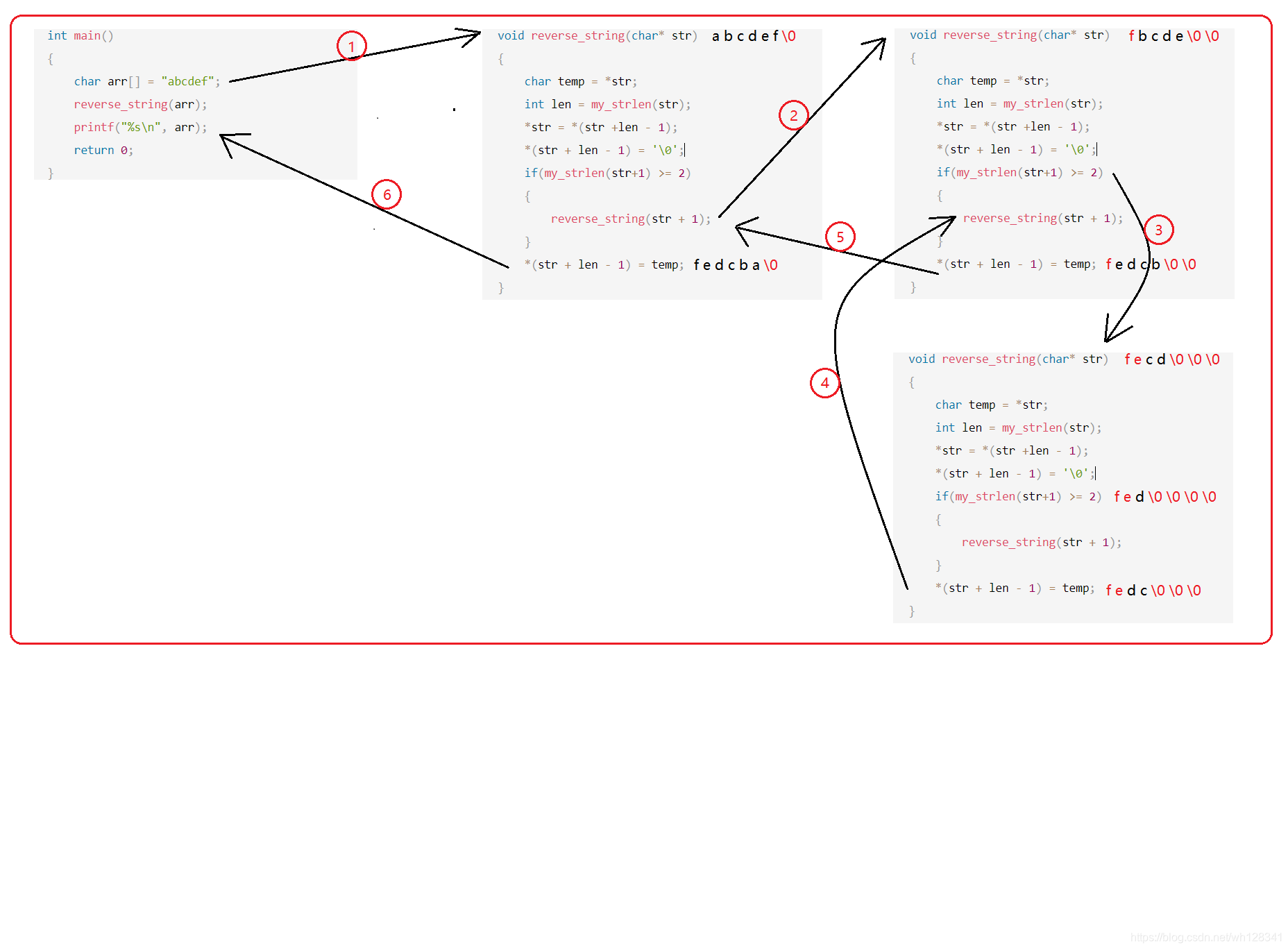 #include<stdio.h> int my_strlen(char* str) { int count = 0; while(*str) { count++; str++; } return count; } void reverse_string(char* str) { char temp = *str;//1 int len = my_strlen(str); *str = *(str +len - 1);//2 *(str + len - 1) = '\0';//3 //只有2个及以上的字符时才递归 if(my_strlen(str+1) >= 2) { reverse_string(str + 1);//4 } *(str + len - 1) = temp;//5 } int main() { char arr[] = "abcdef"; reverse_string(arr); printf("%s\n", arr);//fedcba return 0; }