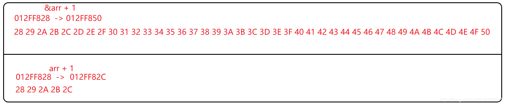 #include<stdio.h> int main() { int arr[10] = {1,2,3,4,5,6,7,8,9,10}; printf("%p\n", &arr);//012FF828 printf("%p\n", &arr + 1);//012FF850 printf("%p\n", arr);012FF828 printf("%p\n", arr + 1);//012FF82C return 0; }
