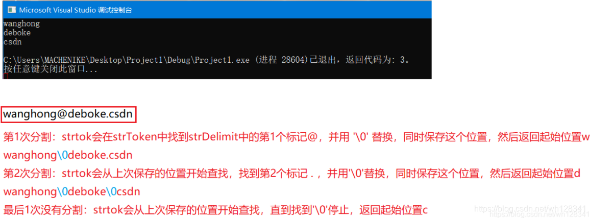#include<stdio.h> #include<string.h> int main() { char arr[] = "wanghong@deboke.csdn"; char* p = "@."; char temp[30] = { 0 }; strcpy(temp, arr); char* ret = NULL; for(ret = strtok(temp, p); ret != NULL; ret = strtok(NULL, p)) { printf("%s\n", ret); } return 0; }