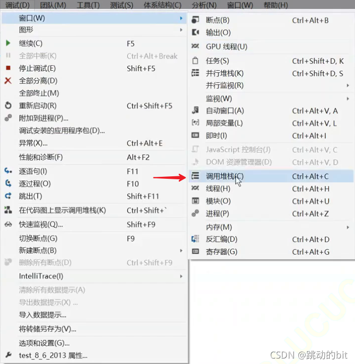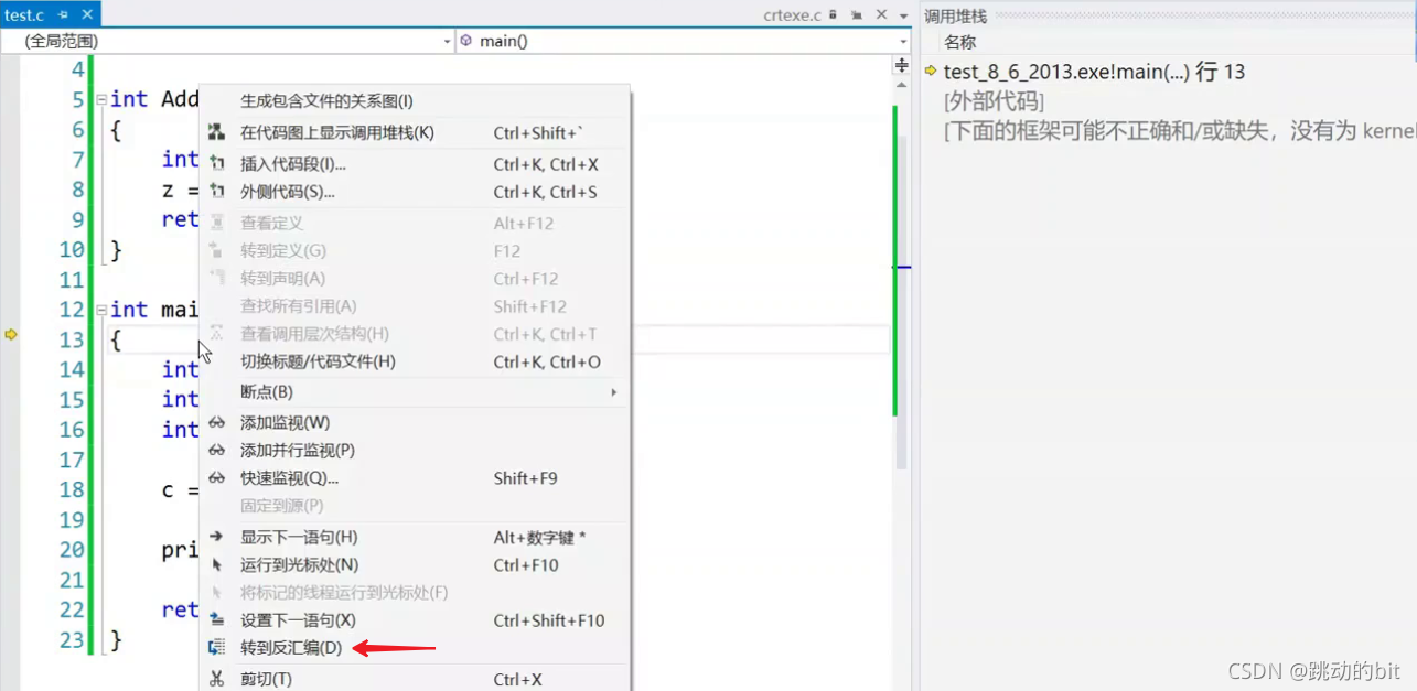 这里观察C语言代码所对应的汇编代码 —— 调试代码后,右击鼠标转到反汇编