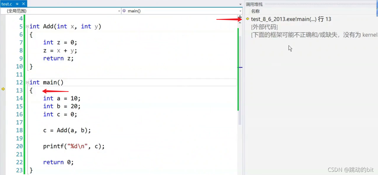 ⚠ 这里使用的环境是 Visual Studio 2013 ,提示不要使用太过高级的编译器,因为越高级的编译器越不容易观察。同时这里需要注意的是在不同的编译器下,函数调用过程中栈帧的创建是略有差异的,具体细节取决于编译器。