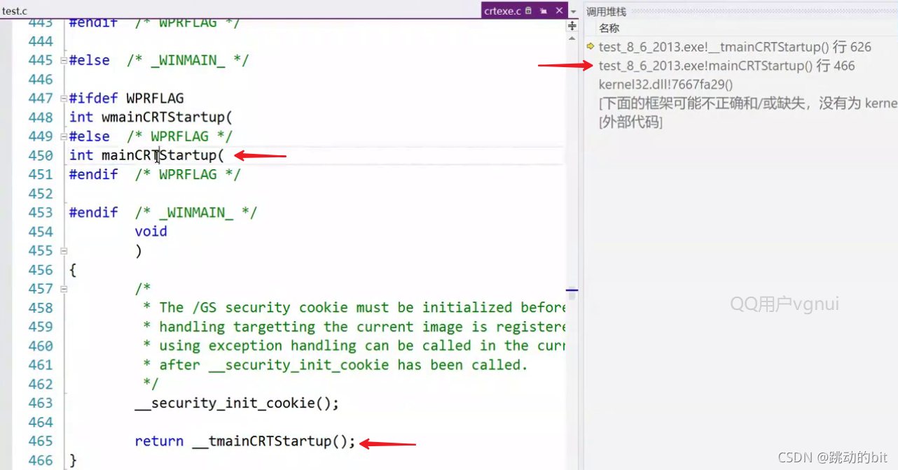 3、当程序继续走时,它跳到了crtexe.c文件中,这时再看堆栈窗口发现 main 函数被 __tmainCRTStartup() 调用