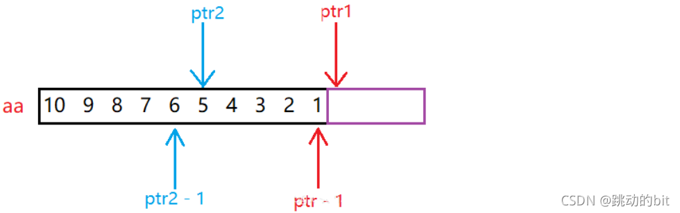 #include<stdio.h> int main() { int aa[2][5] = { 10,9,8,7,6,5,4,3,2,1 }; int* ptr1 = (int*)(&aa + 1); int* ptr2 = (int*)(*(aa + 1); printf("%d, %d", *(ptr1 - 1), *(ptr2 - 1)); return 0; }