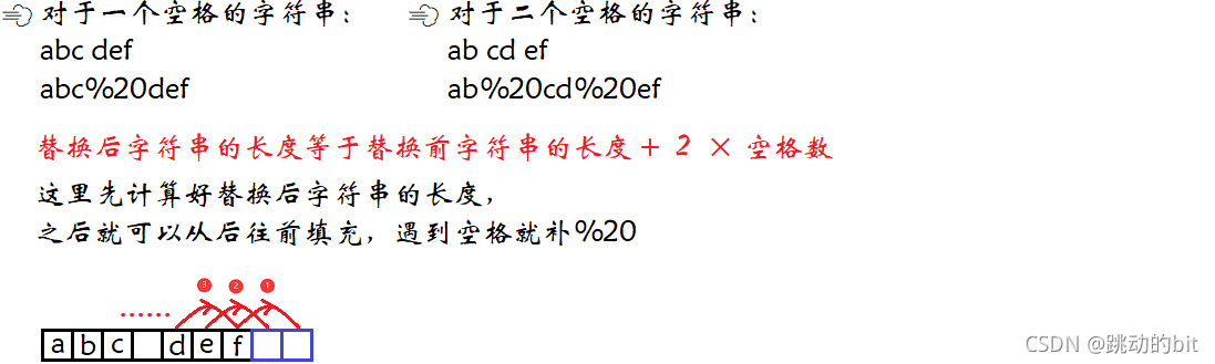 #include<stdio.h> #include<string.h> void ReplaceSpace(char* str, int length) { //1.计算空格的个数 int i = 0; int spcount = 0; for (i = 0; i < length; i++) { if (str[i] == ' ') spcount++; } //2.计算替换空格后新的长度和最后的位置 int newlengh = length + spcount * 2; int pos = newlengh - 1; //3.从后往前填充 for (i = length - 1; i >= 0; i--) { //空格 if (str[i] == ' ') { str[pos--] = '0'; str[pos--] = '2'; str[pos--] = '%'; } //非空格 else { str[pos--] = str[i]; } } } int main() { char arr[20] = "We Are Happy."; ReplaceSpace(arr, strlen(arr)); printf("%s\n", arr); return 0; }
