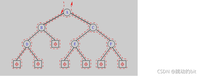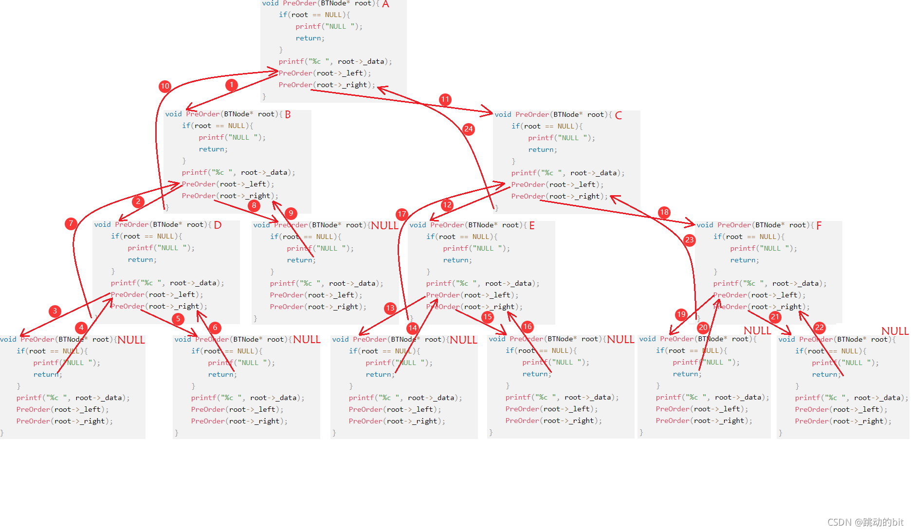 以上真正的核心代码是 PreOrder、InOrder、PostOrder 函数的递归调用短短几行代码却执行了如此复杂的计算,这里豌豆太懒了就只画一个展开图: