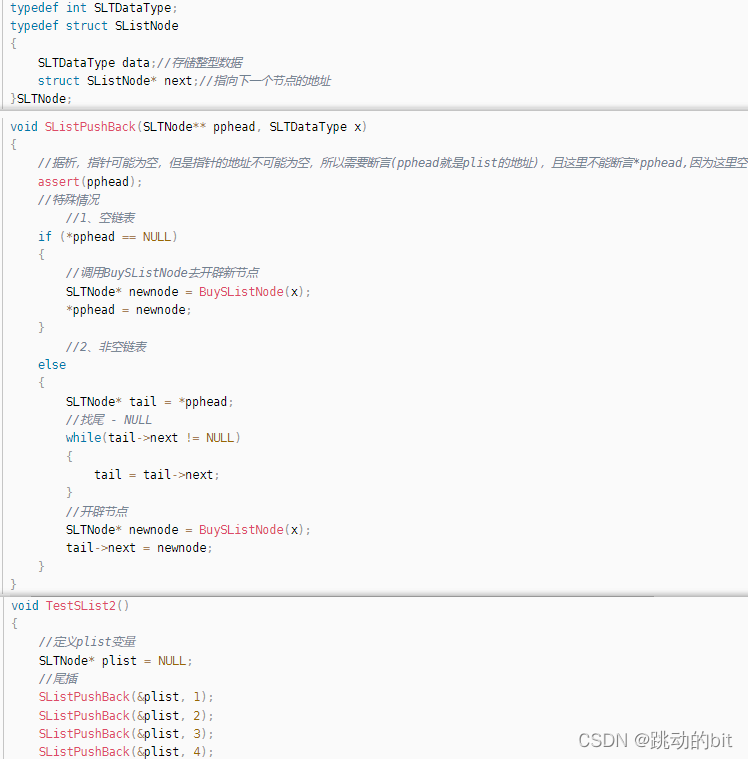 typedef int SLTDataType; typedef struct SListNode { SLTDataType data; struct SListNode* next; }SLTNode, *PSLTNode; void SListPushBack(PSLTNode& phead, int x) { //... }