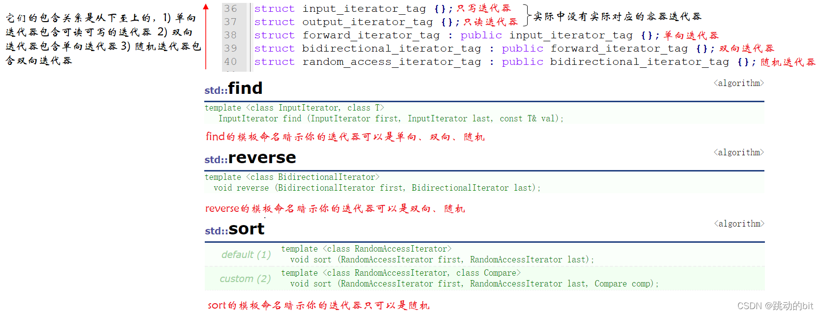 严格来说迭代器是分类型的,在我们的 STL 3.0 中找到 stl_iterator.h 文件,它里面把迭代器类型分为五种,并且它们构成继承关系: