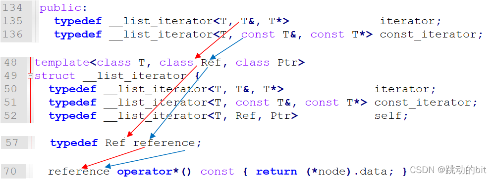 可以看到如下源码的实现,它只实现了一个类,如是是普通迭代器 operator* 的返回值是 T&,如果是 const 迭代器,operator* 的返回值是 const T& - List item