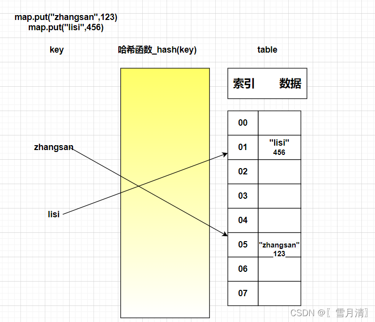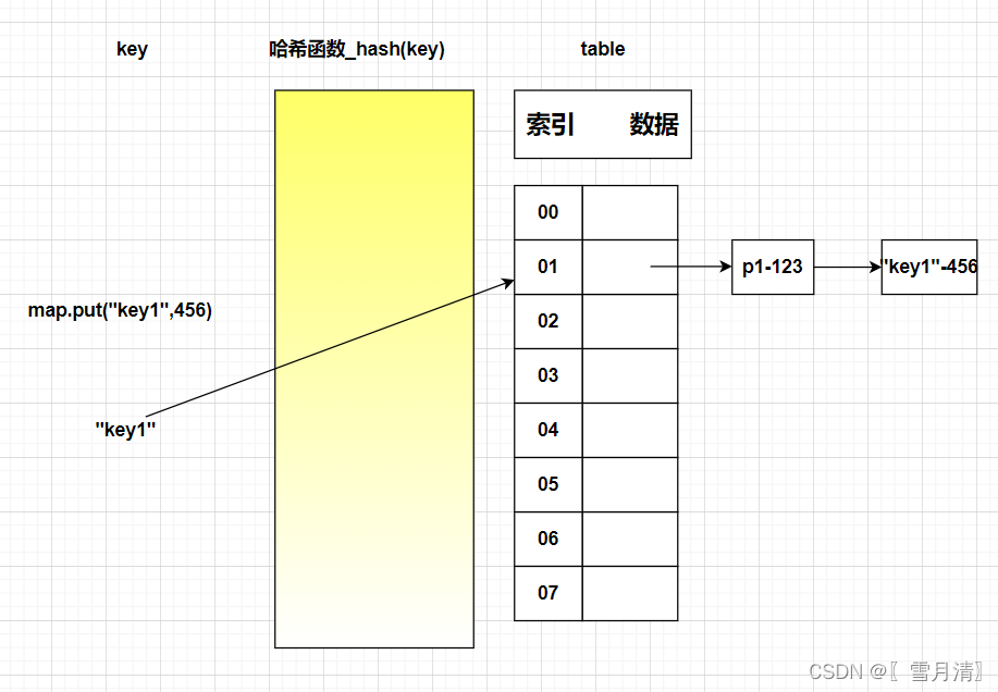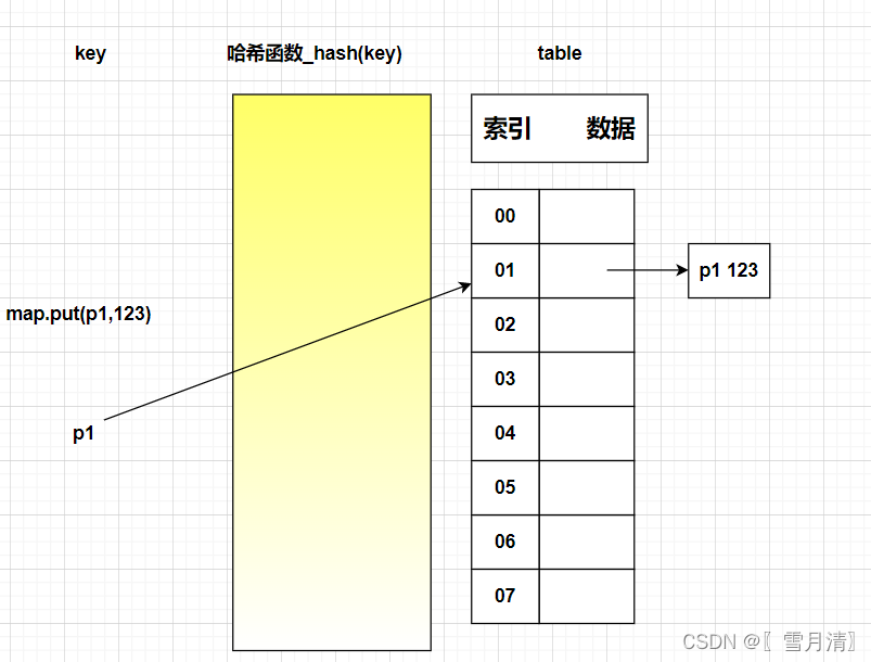 (1)map集合添加键值对(p1,123), 哈希函数计算出p1的哈希值再通过与数组长度进行&运算,假设求出索引为1,并发现此索引数据为空,然后添加数据