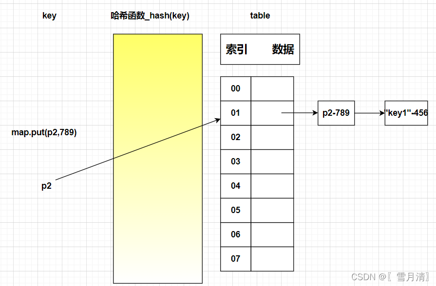 (3)map集合继续添加键值对(p2,789),哈希函数计算哈希值并进行&运算发现p2对应的数组索引是1,然后通过索引知道此时该索引存在数据,从头到尾进行遍历并比较,发p2与p1相同,进行覆盖