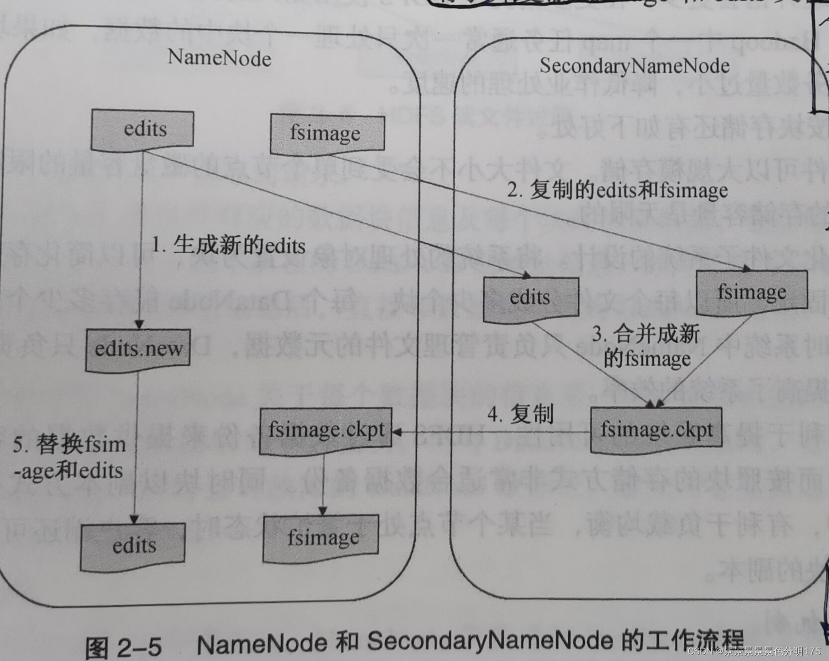 每次系统启动时,NameNode会读取fsimage文件的信息并保存到内从中。在HDFS运行期间,新的操作日志不会立即与fsimage文件进行合并,也不会存到NameNode内存中,而是先写到edits文件中,当edits文件达到一定的阈值或者间隔一定时间(默认为3600s或者达到64MB)后会触发SecondaryNameNode工作,这个时间点被称为checkpoint。具体的合并步骤如下: