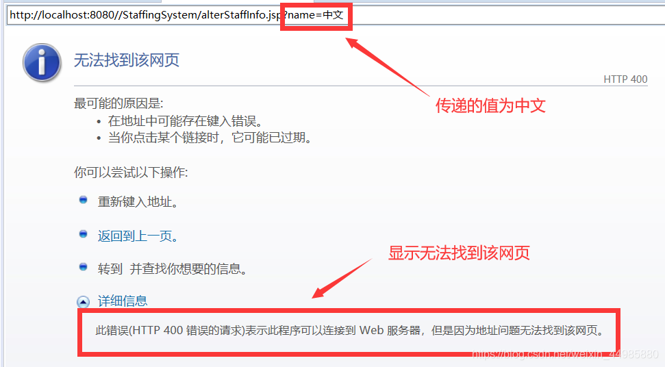 原因是因为在超链接或网址传参中,参数属于网址的一部分,同时这一部分是属于URL编码的,不支持中文的utf-8,因此在传递中文时会显示网址错误,解决办法是将我们要传递的中文转成URL编码即可: