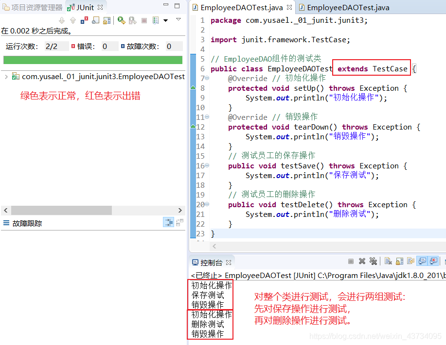 EmployeeDAOTest覆写TestCase中protected void tearDown() throws Exception方法; - 测试执行顺序: