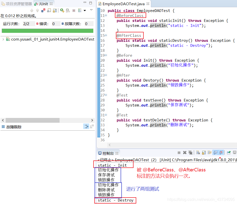 @BeforeClass标签:在所有的Before方法之前执行,只在最初执行一次, 只能修饰静态方法。@AfterClass标签:在所有的After方法之后执行,只在最后执行一次,只能修饰静态方法。 - 测试执行顺序: