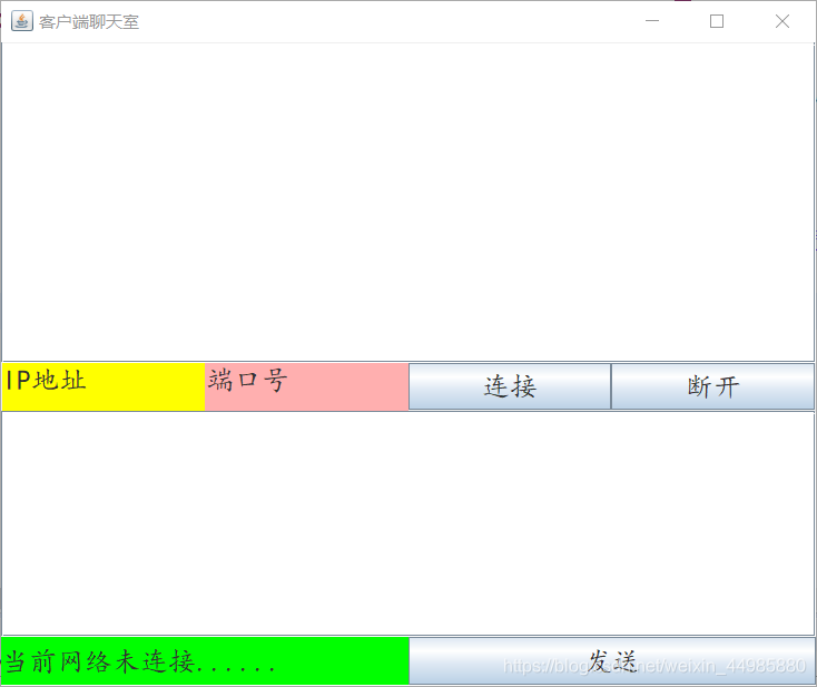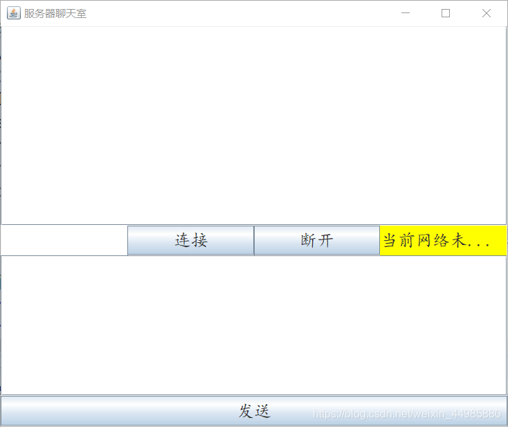 服务器端的界面设计上,主要包括的元素是:连接、断开、发送按钮、消息输入框、消息接收框、端口号输入框等,根据PC端微信的界面原理,可以根据自己的想法简单设计,我设计的服务器端的界面如下: