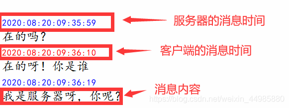 从上面的效果展示中我们可以看到在文本框中我们显示的时间以及客户端服务器发送的消息显示的字体颜色及属性是不一样的,