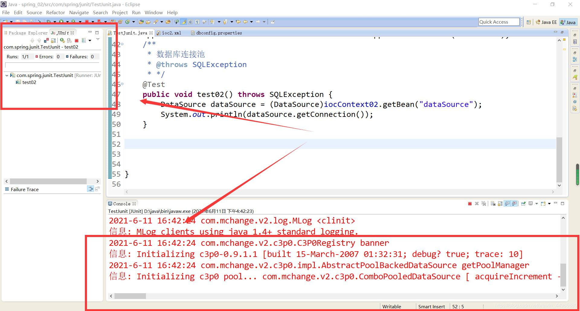 原本一切正常,编译器也没有任何错误提示,但是就是在利用junit进行链接测试的时候,程序总是会先卡住,然后接着报错,不知道遇到这个问题的小伙伴是不是和我是一样的错误界面: