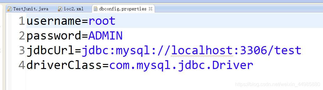 <context:property-placeholder location="classpath:dbconfig.properties"/> <bean id="dataSource" class="com.mchange.v2.c3p0.ComboPooledDataSource"> <property name="user" value="${username}"></property> <property name="password" value="${password}"></property> <property name="jdbcUrl" value="${jdbcUrl}"></property> <property name="driverClass" value="${driverClass}"></property> </bean>