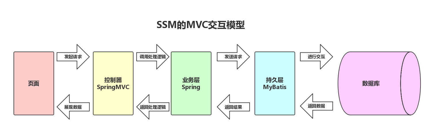 页面发送请求给控制器,控制器调用业务层处理逻辑,逻辑层向持久层发送请求,持久层与数据库交互,后将结果返回给业务层,业务层将处理逻辑发送给控制器,控制器再调用视图展现数据。