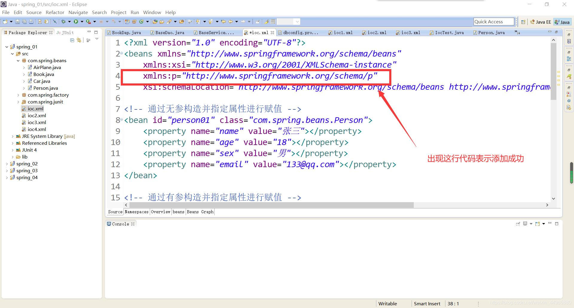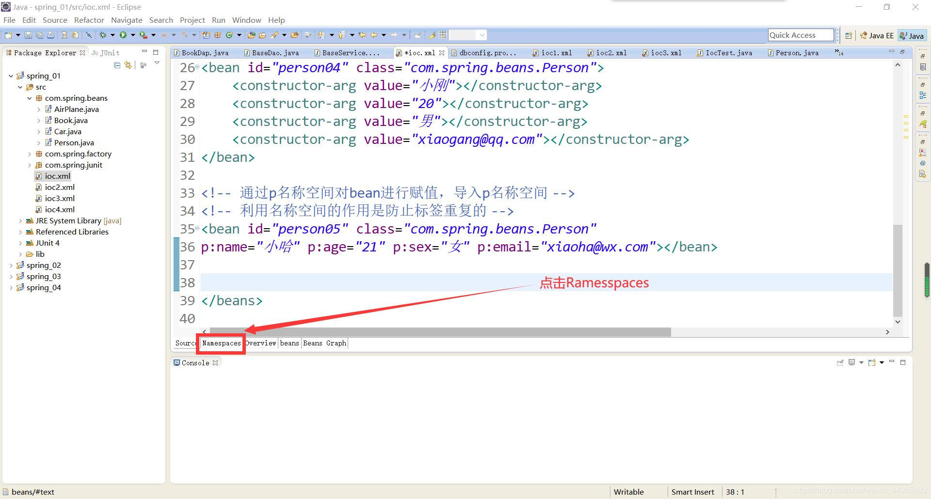 <!-- 通过p名称空间对bean进行赋值,导入p名称空间 --> <!-- 利用名称空间的作用是防止标签重复的 --> <bean id="person05" class="com.spring.beans.Person" p:name="小哈" p:age="21" p:sex="女" p:email="xiaoha@wx.com"></bean>