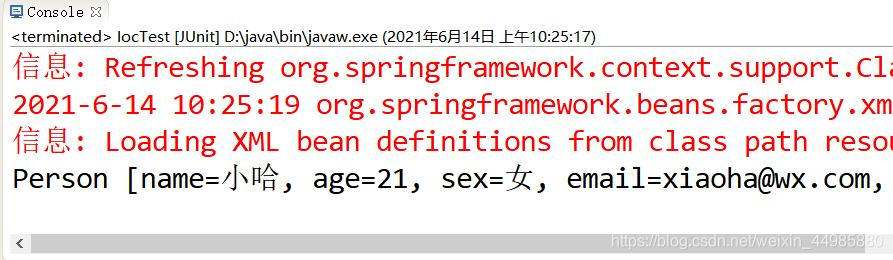 ApplicationContext iocContext = new ClassPathXmlApplicationContext("ioc.xml"); /** * 普通方法获取参数 * */ @Test public void test01() { Person person01 = (Person)iocContext.getBean("person01"); System.out.println(person01); }